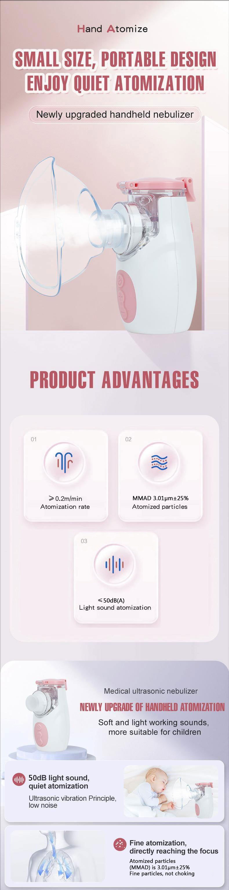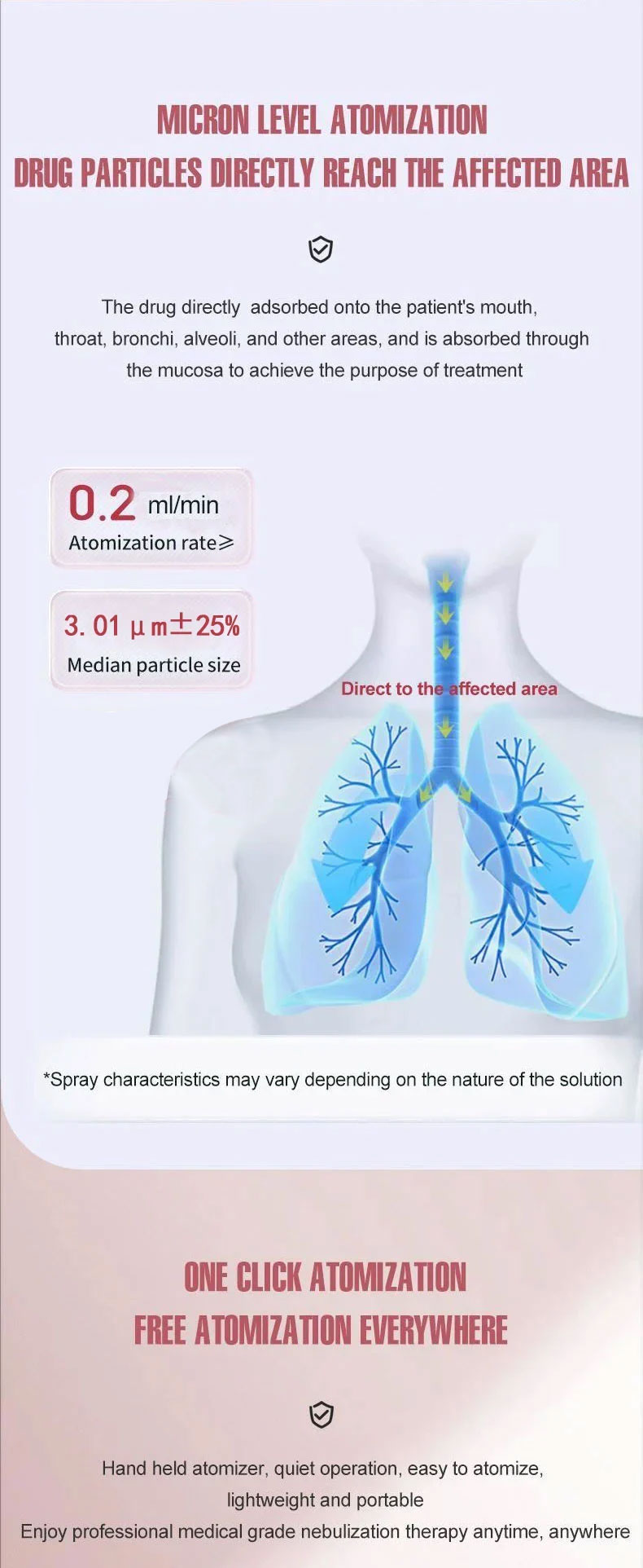 This device utilizes state-of-the-art microporous ultrasonic atomizing mesh technology that sprays liquid medication into fog/vapor form and delivers it directly to the patient for inhalation. Suitable for both adult and pediatric patients(age>1).